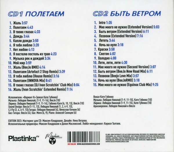 Спустя 20 лет по многочисленным просьбам фанатов Кати Чеховой мы представляем вам эту расширенную компиляцию все треков Варианта К. На двухдисковое издание вошли оба альбома коллектива, включая неизданный альбом 2004 года "Быть Ветром", а также редкие и неизданые ремиксы на треки коллектива. Издание выполнено в виде красочного 6 ти полосного дигипака, и снабжено 12 ти страничным буклетом с редкими фото и историей проекта, рассказанной самой Катей Губенко (Чеховой).
